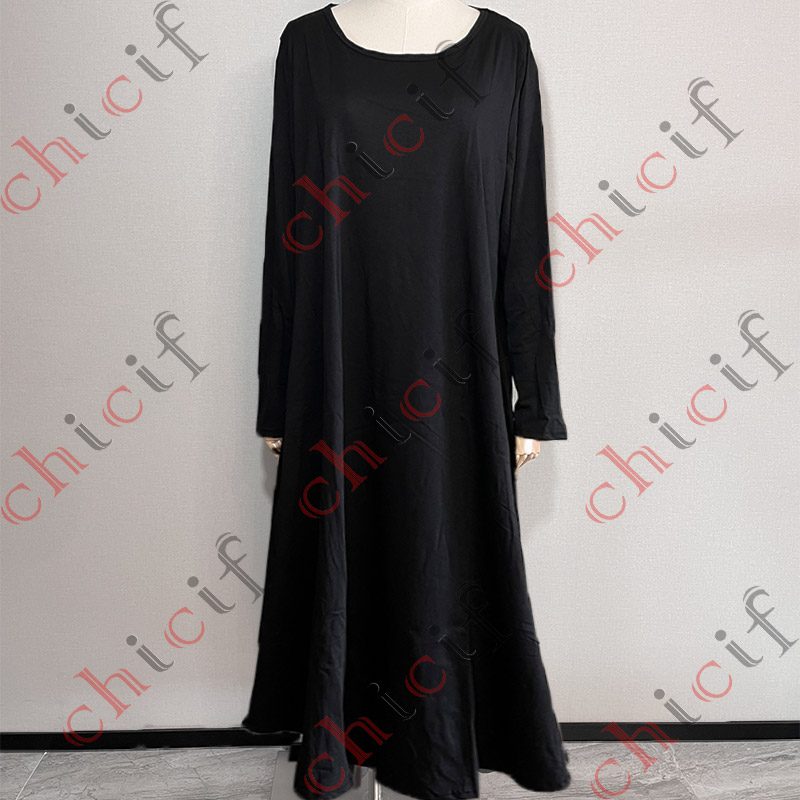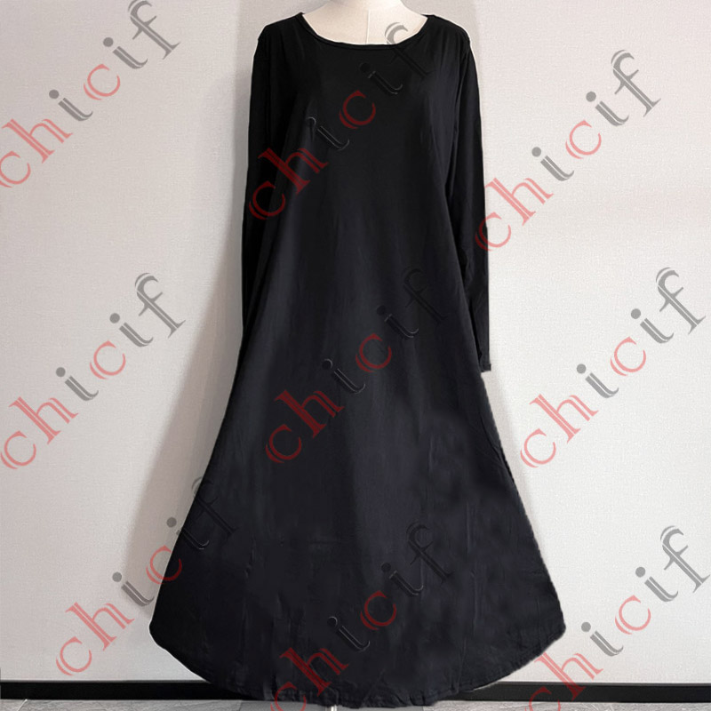 Solid Color Casual Cotton Long Sleeve Curved Hem Loose Pockets Dress