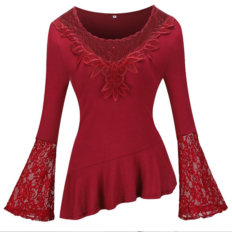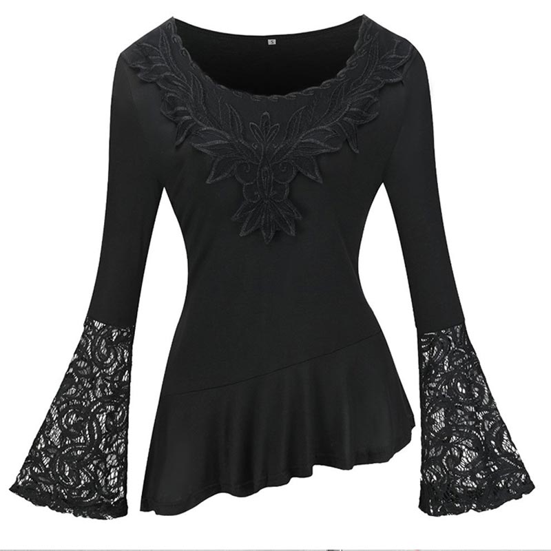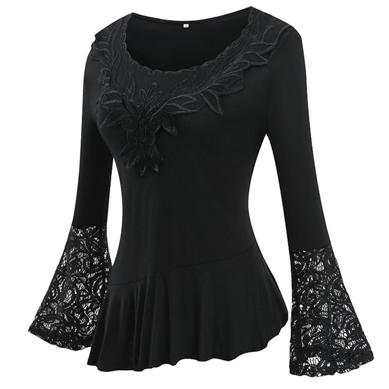 Trendy Long Sleeve Lace Stitching Round Neck A-line Shirt