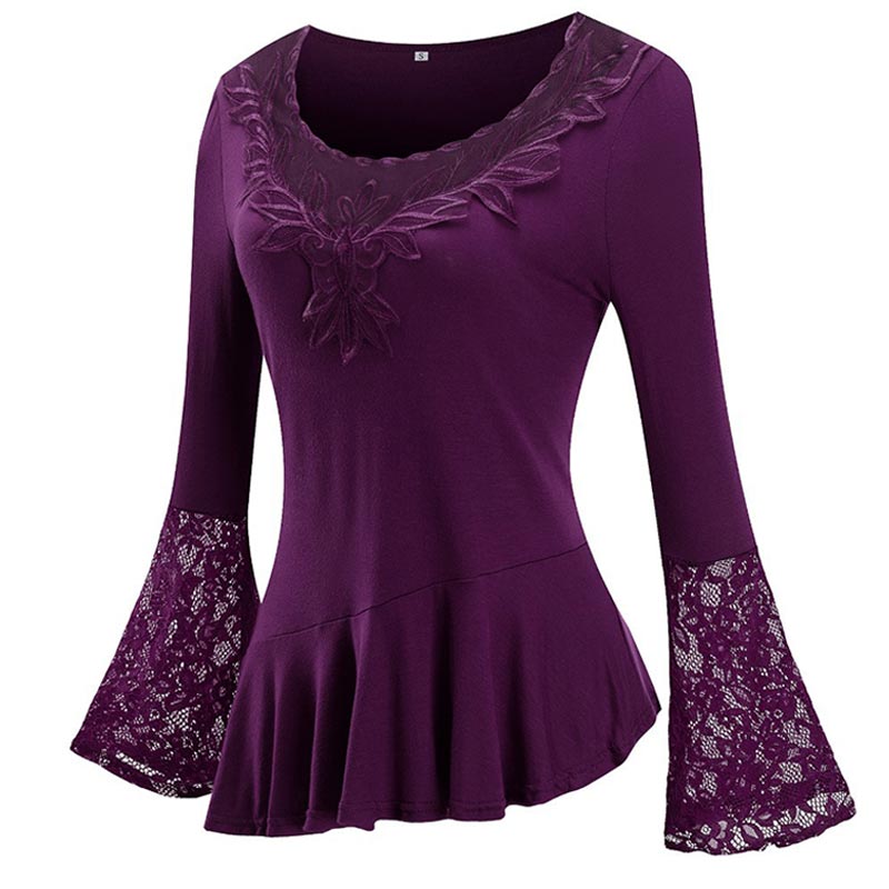 Long Sleeve Lace Stitching Round Neck A-line Tunic Blouse
