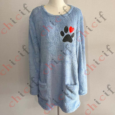 Paw Prints Plush Warm Autumn Winter Pockets Long Sweatshirt