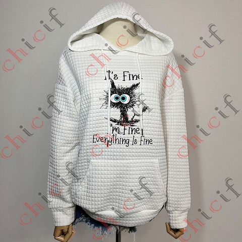 Lovely Cat Printed Waffle Long Sleeve Pocket Hooded Sweatshirt